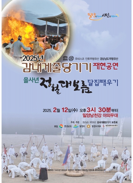 [아시아월드뉴스] 밀양시는 오는 12일 정월대보름을 맞아 경상남도 무형유산인 법흥상원놀이와 감내게줄당기기 공개행사 및 달집태우기 행사를 단장면과 삼문동 일원에서 개최한다고 밝혔다.