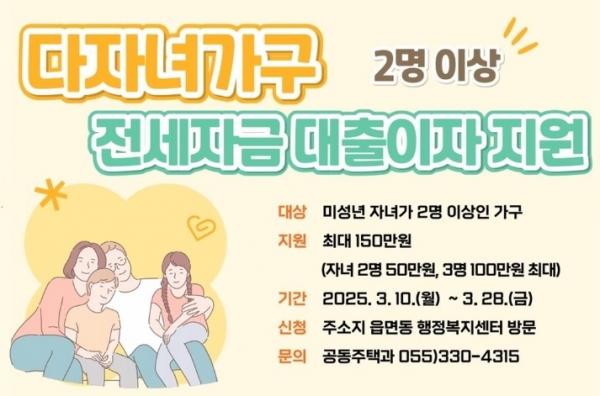 최군식 공동주택과장은 “다자녀가구의 전세자금 대출이자 부담을 조금이나마 덜어드릴 수 있길 바라며 앞으로도 가정의 화목을 유지할 수 있도록 지원에 힘쓰겠다”고 말했다.