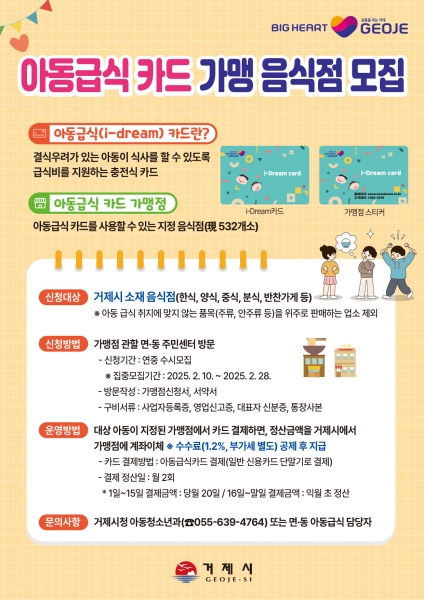 [아시아월드뉴스] 거제시는 아동의 건강한 성장과 발달을 위해 결식 우려가 있는 아동에게 급식을 지원하는 ‘아동급식카드 가맹점’을 모집하고 있다.