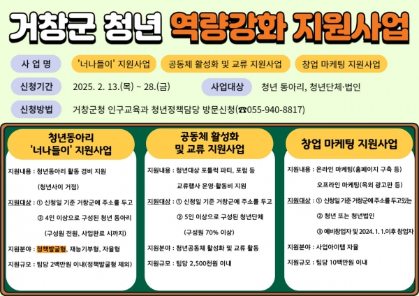 [아시아월드뉴스] 거창군은 13일부터 28일까지 △청년 동아리 ’너나들이‘ 지원사업 △청년 공동체 활성화 및 교류 지원사업 △청년 창업마케팅 지원사업에 참여할 청년들을 모집한다.