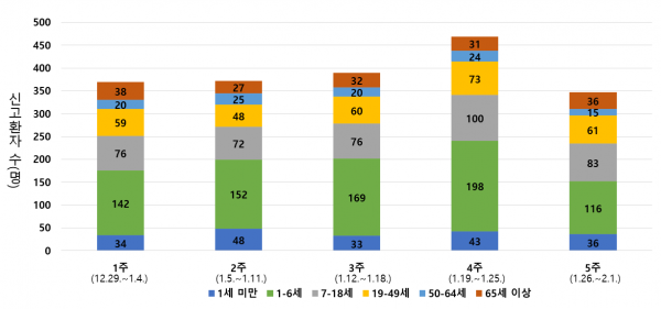 2025.1.19.~1.25. 특히 올해 4주 차 전국 노로바이러스 감염증 전체 환자 중 0~6세 영유아의 비중이 51.4퍼센트로 높게 나타났다.