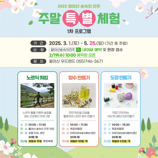 [아시아월드뉴스] 진주시는 3월 1일부터 5월 25일까지 월아산 숲속의 진주에서 ‘2025년 주말 특별체험 프로그램’을 운영한다.