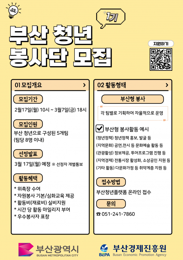 [아시아월드뉴스] 부산시는 청년들의 자발적인 봉사활동을 통해 지역사회 문제를 해결하고 나눔과 배려의 문화를 확산하기 위한 '2025년 부산청년봉사단'을 오늘부터 모집한다고 밝혔다.