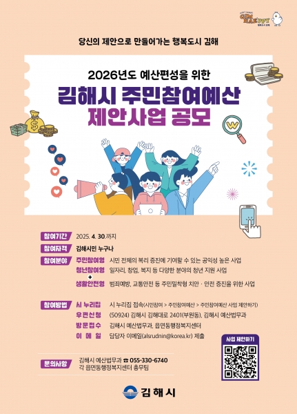 [아시아월드뉴스] 김해시는 17일부터 4월 30일까지 2026년도 예산에 반영할 ‘주민참여예산 제안사업’을 공모한다.