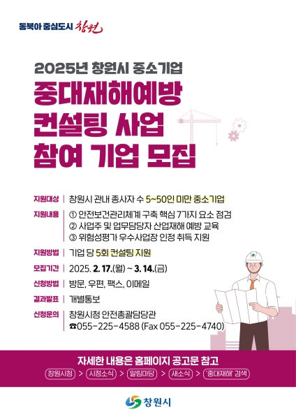 [아시아월드뉴스] 창원특례시는 최근 중대재해예방의 중요성이 증대됨에 따라 안전보건관리체계 자력 구축에 어려움을 겪는 중소기업을 대상으로 ‘2025년 중소기업 중대재해예방 컨설팅’을 시행한다.