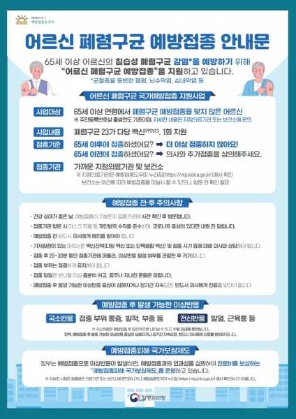 65세 이상이면서 폐렴구균 다당백신을 한 번도 접종하지 않은 어르신은 전국 주소지와 관계없이 지정의료기관을 방문하면 1회 무료로 접종할 수 있다.