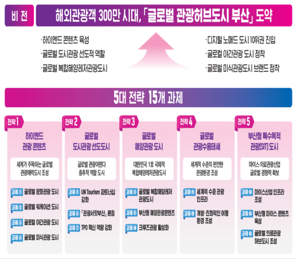 △부산관광포털 ‘비짓부산’ 고도화 △외국인 전용 ‘비짓부산패스’ 활성화 △국가별 ‘맞춤형 관광세일즈’ 추진 등과 함께 △유엔세계관광기구와의 협력 체계도 구축해 전 세계 관광객에게 부산을 알리려 노력했으며 그 결과 빠르게 관광객 수를 회복할 수 있었다.
