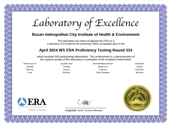 [아시아월드뉴스] 부산시 보건환경연구원은 지난해 9개 환경 분야에 대해 미국 환경자원협회 주관 국제숙련도 평가와 국립환경과학원 주관 국내숙련도 평가에서 모두 '적합'으로 인증받았다고 밝혔다.