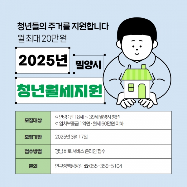 [아시아월드뉴스] 밀양시는 청년층의 주거비 부담 절감을 위한 2025년 청년 월세 지원사업 신청을 오는 3월 17일까지 받는다.