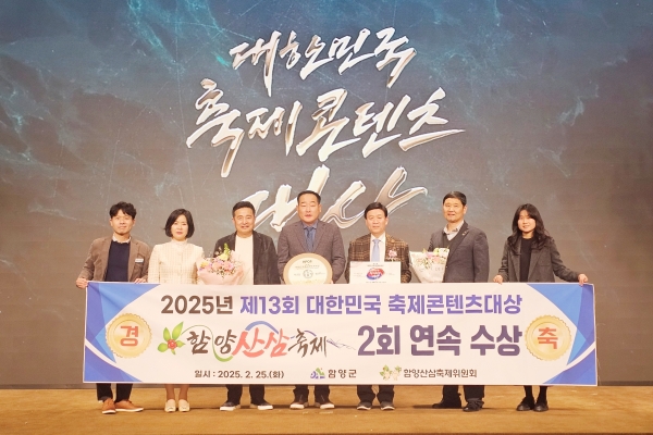 [아시아월드뉴스] 함양군의 대표 축제인 함양산삼축제가 2월 25일 서울 전쟁기념관 내 컨벤션에서 열린 제13회 대한민국 축제 콘텐츠 대상 시상식에서 축제경제 부문 2년 연속 대상을 수상하는 영예를 안았다.