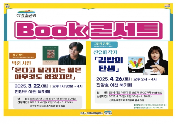시 관계자는 “음악과 책이 어우러진 진양호공원 북 콘서트를 통해 시인과 그림책 작가를 가까이에서 만나 따듯한 이야기를 나누고 흥미진진한 체험을 함께하며 가족과 소중한 추억을 쌓는 시간이 되길 바란다”고 말했다.