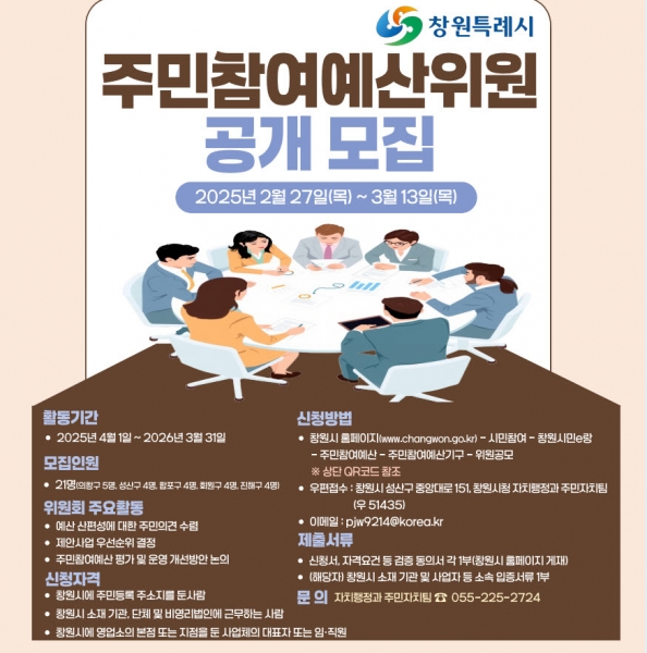 [아시아월드뉴스] 창원특례시는 올해 3월 말로 만료되는 주민참여예산위원 임기를 맞아 원활한 위원회 운영을 위해 2월 27일부터 3월 13일까지 신규 위원을 모집한다.