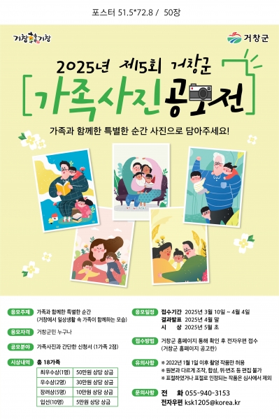 [아시아월드뉴스] 거창군은 결혼·출산·육아에 대한 관심을 유도해 가족 친화적인 사회 분위기를 조성하고 저출산 극복에 대한 사회적 공감대를 형성하기 위해 ‘2025년 제5회 거창군 가족사진 공모전’을 개최한다.