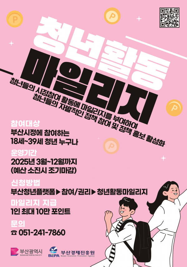 김귀옥 시 청년산학국장은 “청년활동마일리지 제도를 통해 청년의 자발적인 시정 참여를 장려하고 정책 홍보를 활성화하고자 한다”며 “청년들이 부산의 시정에 더욱 적극적으로 참여할 수 있도록 지속해서 제도를 개선하고 확대해 나갈 것”이라고 전했다.