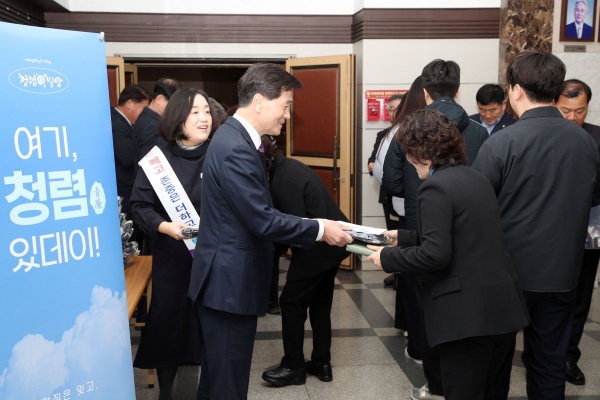 이날‘여기 청렴있데이’는 간부 공무원들이 대강당 입구에서 직원들을 직접 맞이하고 청렴 리플릿과 청렴 홍보 물품을 전달하며 시작됐다.