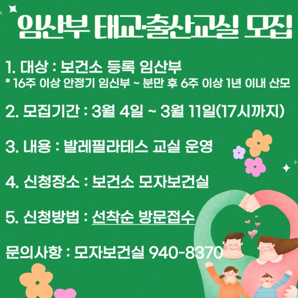 이번 태교·출산 교실은 임신 중 건강관리와 출산부의 산후조리를 위한 사업으로 보건소 등록 임산부 중 16주 이상 안정기 임신부부터 출산 후 1년 이내 임산부 20명을 대상으로 진행한다.
