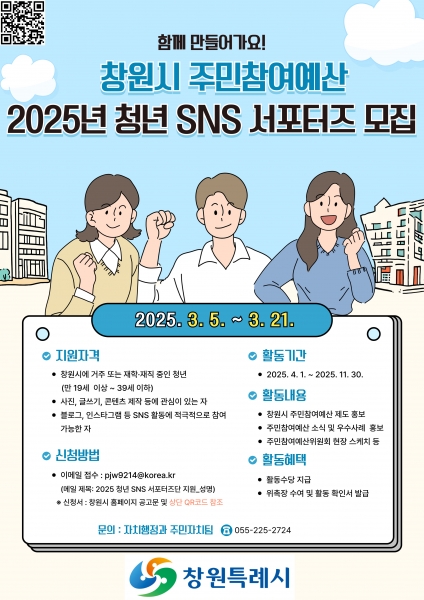 [아시아월드뉴스] 창원특례시는 주민참여예산제도를 널리 알리고 청년층의 관심과 참여를 높이기 위해 ‘창원시 주민참여예산 청년 SNS 서포터즈’를 모집한다고 밝혔다.