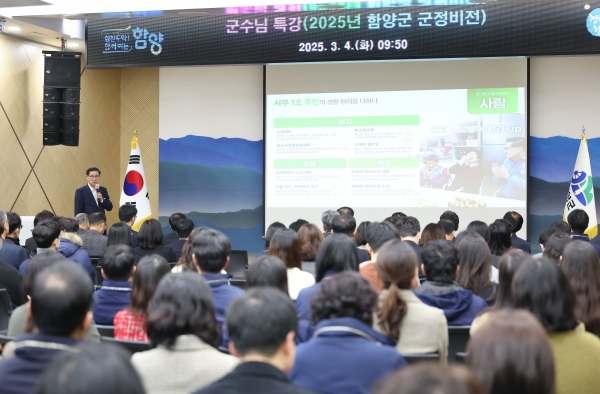 특강 순서에서는 진병영 군수가 직접 ‘2025년 함양군 군정 비전’을 직원들에게 설명하며 지난해 성과 및 반성, 올해 군정방향 등을 공유하는 시간을 가졌다.