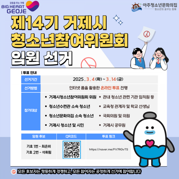 [아시아월드뉴스] 거제시는 3월 4일부터 3월 14일까지 제14기 거제시청소년참여위원회 활동을 주도해 나갈 임원 선거를 실시한다.