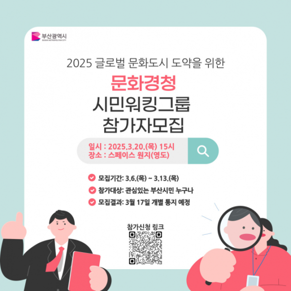 참여를 희망하는 시민은 내일부터 시 누리집 알림배너 또는 부산문화재단 누리집 등을 통해 참가 신청이 가능하며 기타 문의사항은 시 문화예술과 문화정책팀으로 문의하면 된다.