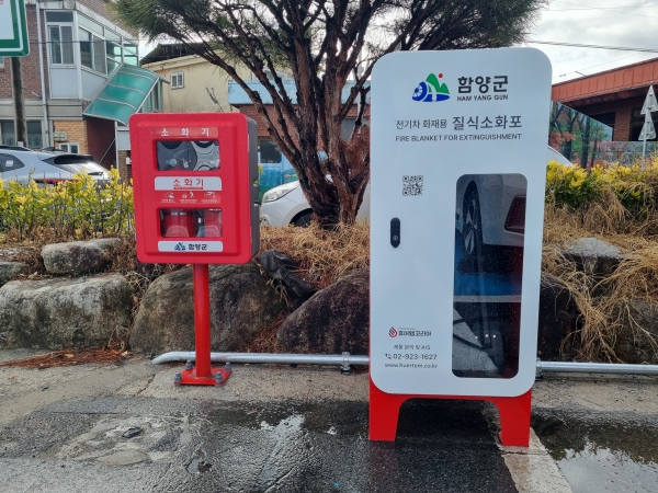 [아시아월드뉴스] 함양군은 전기자동차 화재 예방과 신속한 초기 대응을 위해 군청 주차장 전기차 충전소 옆에 질식소화포와 소화기함을 설치했다.