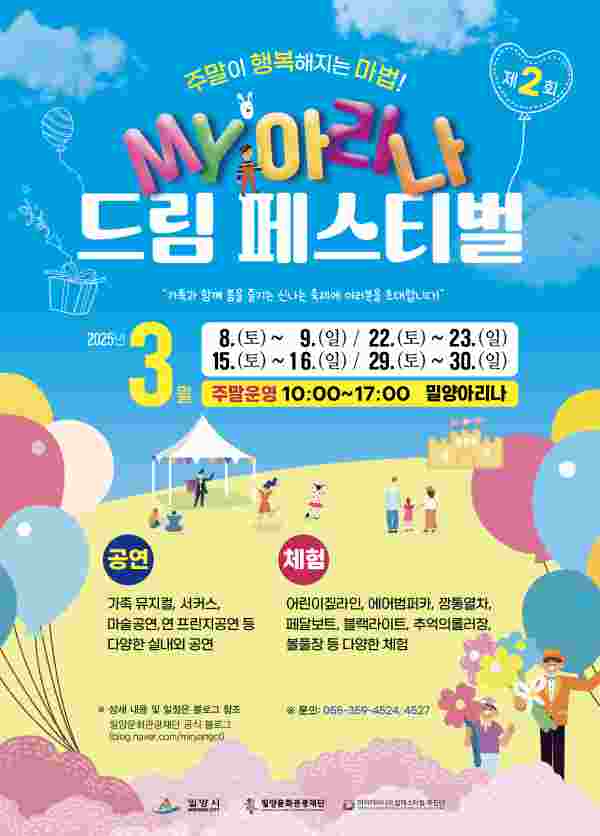 [아시아월드뉴스] 경남 밀양시는 오는 8일부터 30일까지 밀양아리나에서 온 가족이 함께 공연과 체험을 즐길 수 있는 제2회 MY아리나 드림 페스티벌을 개최한다고 밝혔다.