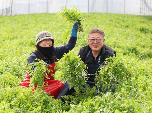 [아시아월드뉴스] 6일 경남 함양군 백전면 백은리 윗 새재농원 시설하우스에서 홍정표씨 부부가 고랭지 지하암반수로 재배한 청정 밭미나리를 수확하고 있다.