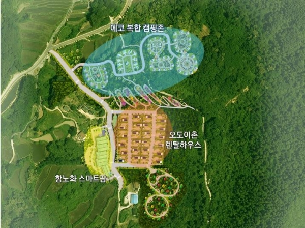 사업규모는 10만㎡ 내외의 부지에 지방소멸대응기금 등 190여억원을 투입해 주거형 렌탈 하우스 24동과 항노화 스마트 팜, 에코 복합 캠핑 존 등을 조성한다.