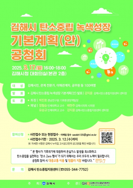 시 관계자는 “탄소중립사회로의 전환을 위해서는 모든 사회구성원의 공감과 협력이 필요하다”며 “김해시의 실효성 있는 기본계획 수립을 위해 시민 여러분의 많은 관심과 참여를 부탁드린다”고 말했다.