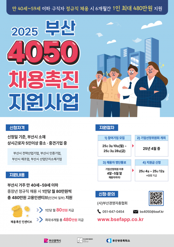 [아시아월드뉴스] 부산시는 ‘2025 부산 4050 채용촉진 지원사업’에 참여할 기업을 오늘부터 3월 28일까지 모집한다고 밝혔다.
