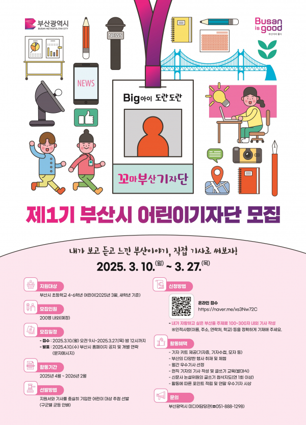 박광명 시 대변인은 “이번에 모집하는 어린이기자단이 지역에 대한 자부심을 가지고 직접 취재와 글쓰기를 경험할 수 있도록 우리시는 아낌없이 지원할 것”이라며 “부산을 대표하는 어린이기자단으로서 적극적인 참여를 기대한다”고 전했다.