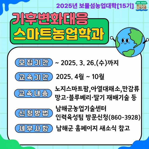 [아시아월드뉴스] 남해군농업기술센터가 남해군 농업을 선도할 전문농업인을 양성하기 위해 오는 26일까지 2025년 보물섬농업대학 교육생을 모집한다.
