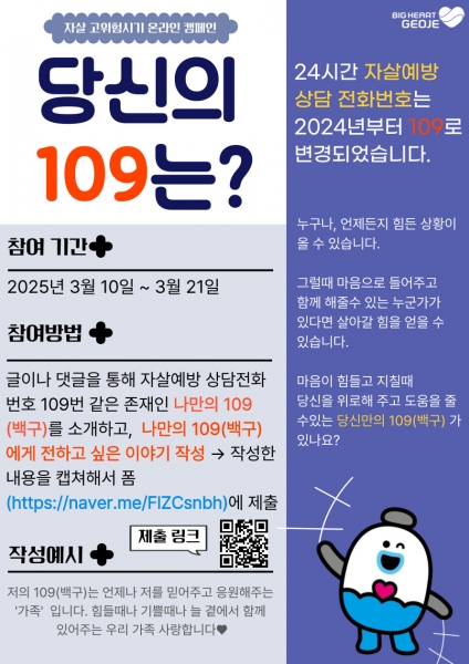 거제시 정신건강복지센터는 이러한 시기적 특성을 고려해 유동인구가 많은 장소에 현수막 게시하고 대형 전광판 홍보를 통해 자살 예방 상담전화번호 109를 안내해 자살과 정신건강에 대한 지역주민의 관심을 유도하고 지역사회 생명 존중 문화 확산을 위한 분위기를 조성할 예정이다.