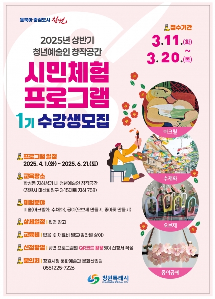 [아시아월드뉴스] 창원특례시는 시민들에게 문화예술 향유 기회를 제공하기 위해 청년예술인 창작공간 시민체험 프로그램 1기 수강생을 모집한다.