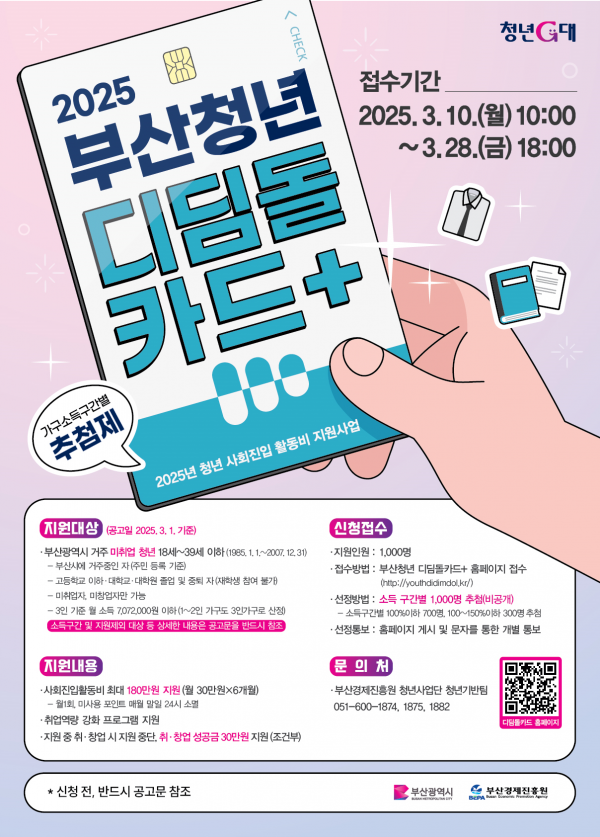 ‘청년 사회진입 활동비 지원 사업’은 부산시에 거주하는 기준중위소득 150퍼센트 이하인 18~39세의 미취업 청년에게 '청년디딤돌 카드+' 포인트를 월 30만원씩 6개월간 지급해 구직활동에 도움이 될 수 있도록 지원하는 사업이다.