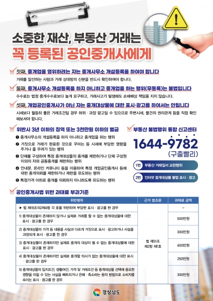 노민섭 민원소통과장은 “중개업소에 대한 지속적인 지도·점검을 통해 불법 중개행위를 근절하겠다”며 “상시 모니터링을 통해 올바른 부동산 거래 질서를 확립하고 군민들이 안심하고 거래할 수 있는 환경을 조성하겠다”고 말했다.