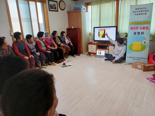 [아시아월드뉴스] 함양군 보건소 정신건강복지센터는 지난 한 달간 자살 예방 사업의 하나로 운영 중인 농약 안전 보관함 보급 사업의 사후관리를 위해 ‘농약 안전 보관함 올바른 사용법 교육 및 자살 예방 생명지킴이 양성 교육’을 실시했다.