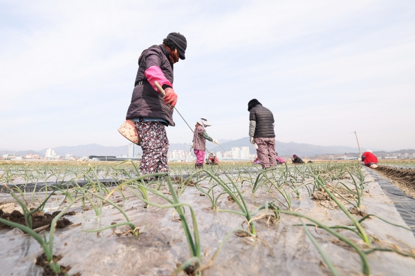 [아시아월드뉴스] 포근한 날씨를 보인 11일 경남 함양군 함양읍 한들 양파논에서 인부들이 양파 생육에 도움을 주는 양파잎 세우기 작업을 하고 있다.