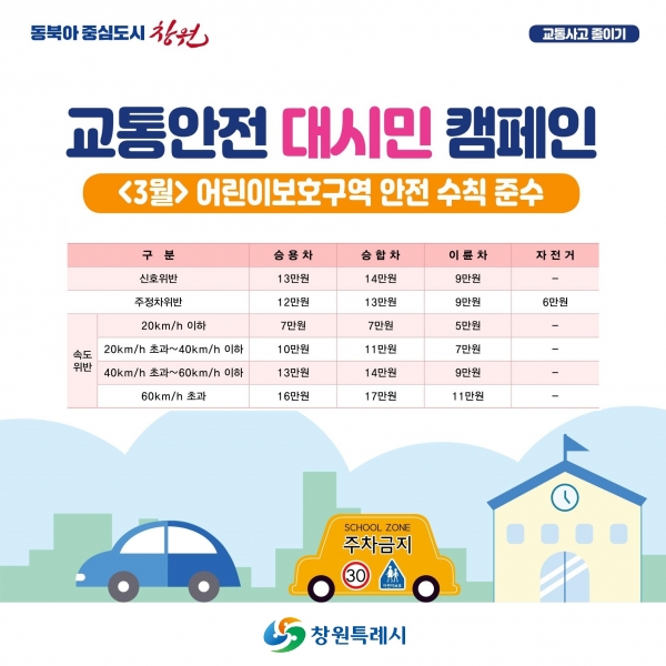 [아시아월드뉴스] 창원특례시는 3월 신학기를 맞아 어린이통학로 교통안전 강화를 위해 ‘어린이보호구역 교통안전 수칙 준수’ 캠페인을 집중 홍보한다고 11일 밝혔다.