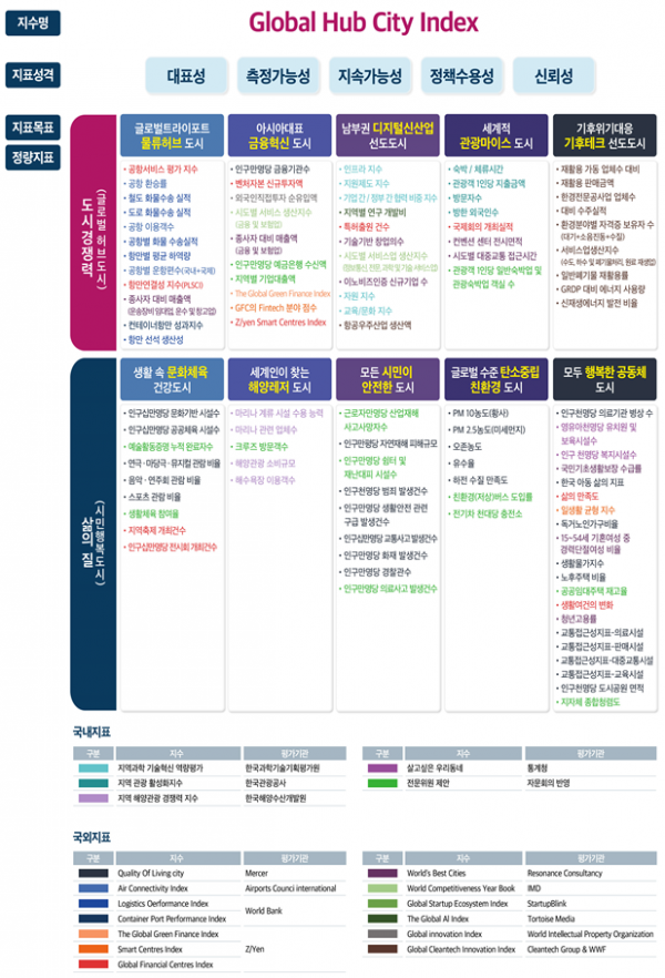 ‘글로벌 허브 시티 인덱스’는 민선 8기 핵심 목표인 ‘글로벌 허브도시’ 와 ‘시민행복도시’를 종합 평가할 수 있는 지표로 시계열적 관리를 통해 통계 기반 정책 수립 지원하고 정책 평가하는 근거를 마련하기 위해 구축했다.