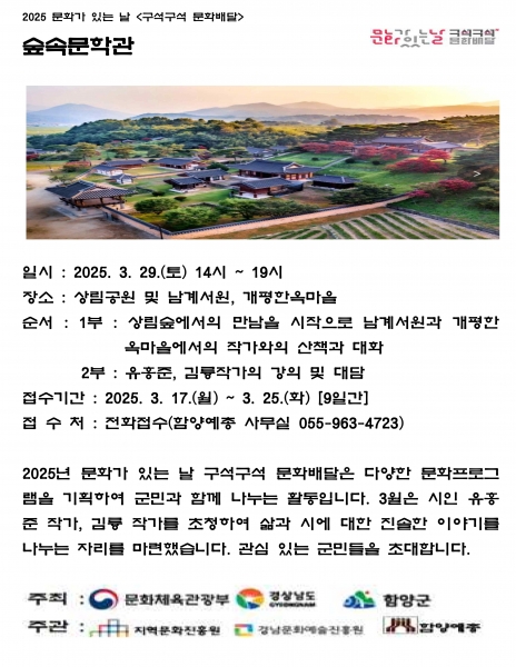 3월의 주제는 ‘숲속문학관’ 으로 오는 29일 토요일 오후 2시부터 7시까지 유홍준, 김륭 작가와 함께 함양 상림, 남계서원, 개평한옥마을을 여행하며 작가의 시와 삶에 대한 진솔한 이야기를 나누는 시간을 마련할 예정이다.