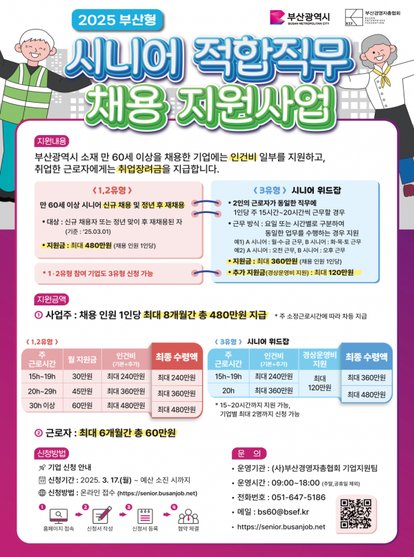 이번 사업은 시가 선정한 '부산형 장년 적합 직무' 분야에 60세 이상 구직자를 채용할 시, 채용 인원 1인당 매월 최대 60만원씩 8개월간 총 480만원의 인건비 일부를 기업에 지원한다.