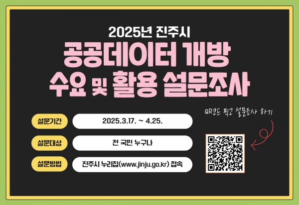 [아시아월드뉴스] 진주시는 시민 목소리를 반영한 맞춤형 공공데이터 개방을 통해 공공데이터의 활용도를 높이기 위한 ‘공공데이터 개방 수요 및 활용 설문조사’를 오는 4월 25일까지 실시한다고 밝혔다.
