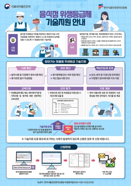 음식점 위생등급제 기술지원 사업은 평가기준 및 주요 지적사항 안내 등 영업자의 이해를 돕고 위생등급제를 보다 쉽게 준비할 수 있도록 전반적인 교육과 현장 방문을 통한 1:1 맞춤형 컨설팅으로 무상으로 지원한다.