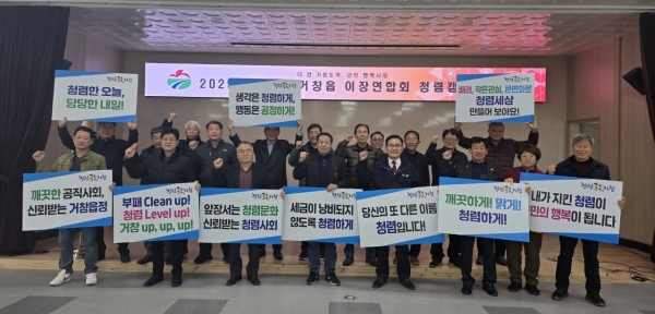 이날 청렴 캠페인은 공직사회 및 지역 사회에 청렴 문화를 확산하고 이장들과 직원 간의 신뢰를 바탕으로 공정하고 투명한 행정을 구현하기 위해 마련된 자리로 참석자들은 청렴 결의문 낭독, 생활 속 청렴 실천을 다짐하는 등 결의를 다졌다.