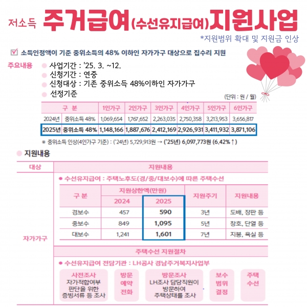 중위소득 48% 이하 주거급여 대상자 중 주택을 소유한 저소득 가구가 대상이며 총 228가구가 혜택을 받을 예정이다.
