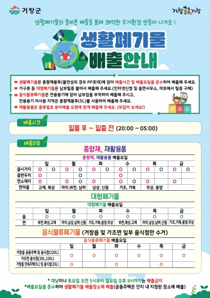 [아시아월드뉴스] 거창군은 올바른 생활폐기물 배출로 자원의 재활용률을 높이고 군 미관을 개선하기 위해 올바른 생활폐기물 배출 방법을 안내했다.