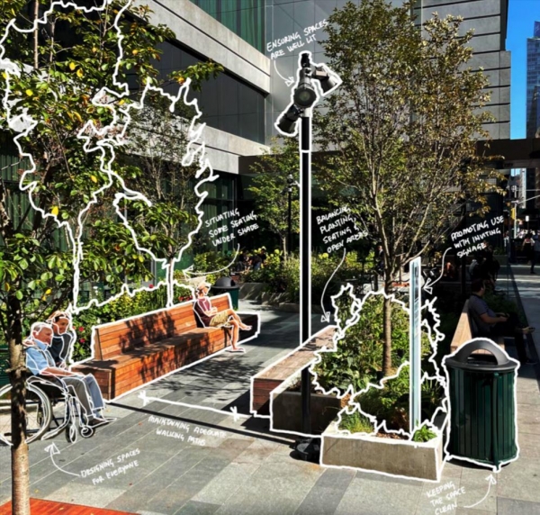 이러한 공공 공간은 보도에서 쉽게 볼 수 있고 공공보도 옆에 좌석과 편의시설을 제공한다.