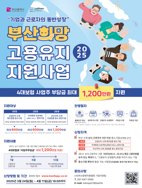 또한, 부산 소재 상시근로자 5인 이상의 산단 소재 제조업종 중소기업 또는 부산 지역특화 프로젝트 기업은 이번 사업을 통해 기업당 최대 600만원의 4대 보험료 사업주 부담금을 지원받을 수 있다.