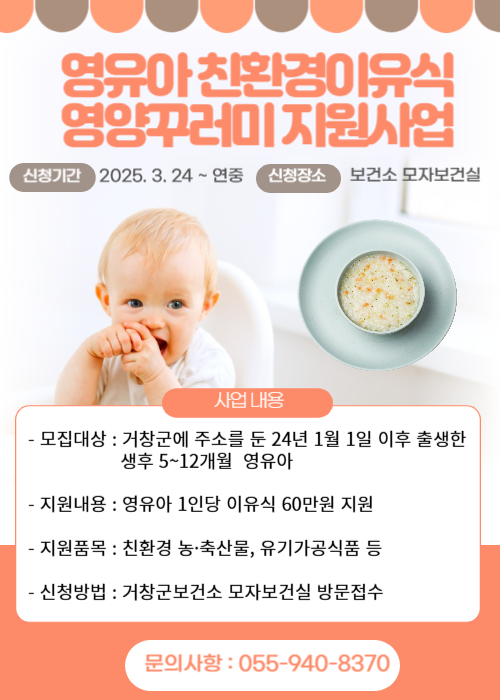 [아시아월드뉴스] 거창군은 3월 24일부터 영유아의 건강증진을 위한 ‘2025년 영유아 친환경 이유식 영양꾸러미 지원사업’의 대상자를 모집한다.